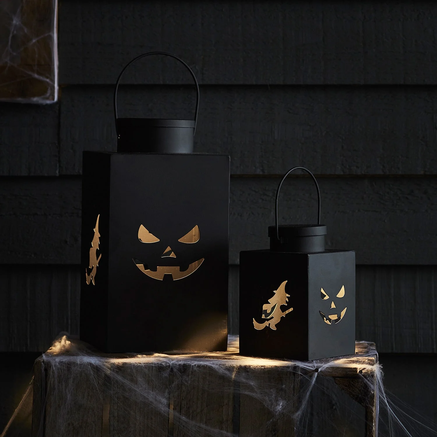 Add a spooky glow to your home and garden this Halloween with our black metal lanterns. With a witch and jack-o-lantern face cut out on either side of both lanterns and a sleek black finish, this duo is a stylish way to bring a Halloween feel this season. || With heights of 28cm and 15.5cm, place them around your front door to welcome all of your trick or treaters with a warm glow. Each lantern has an LED within, simply pop 3 x AAA batteries (sold separately) into the base of each lantern and choose the 6 hour timer function for a ghoulish glow at the same time each night. You can expect up to 60 hours of illumination time before you’ll need to refresh the batteries.