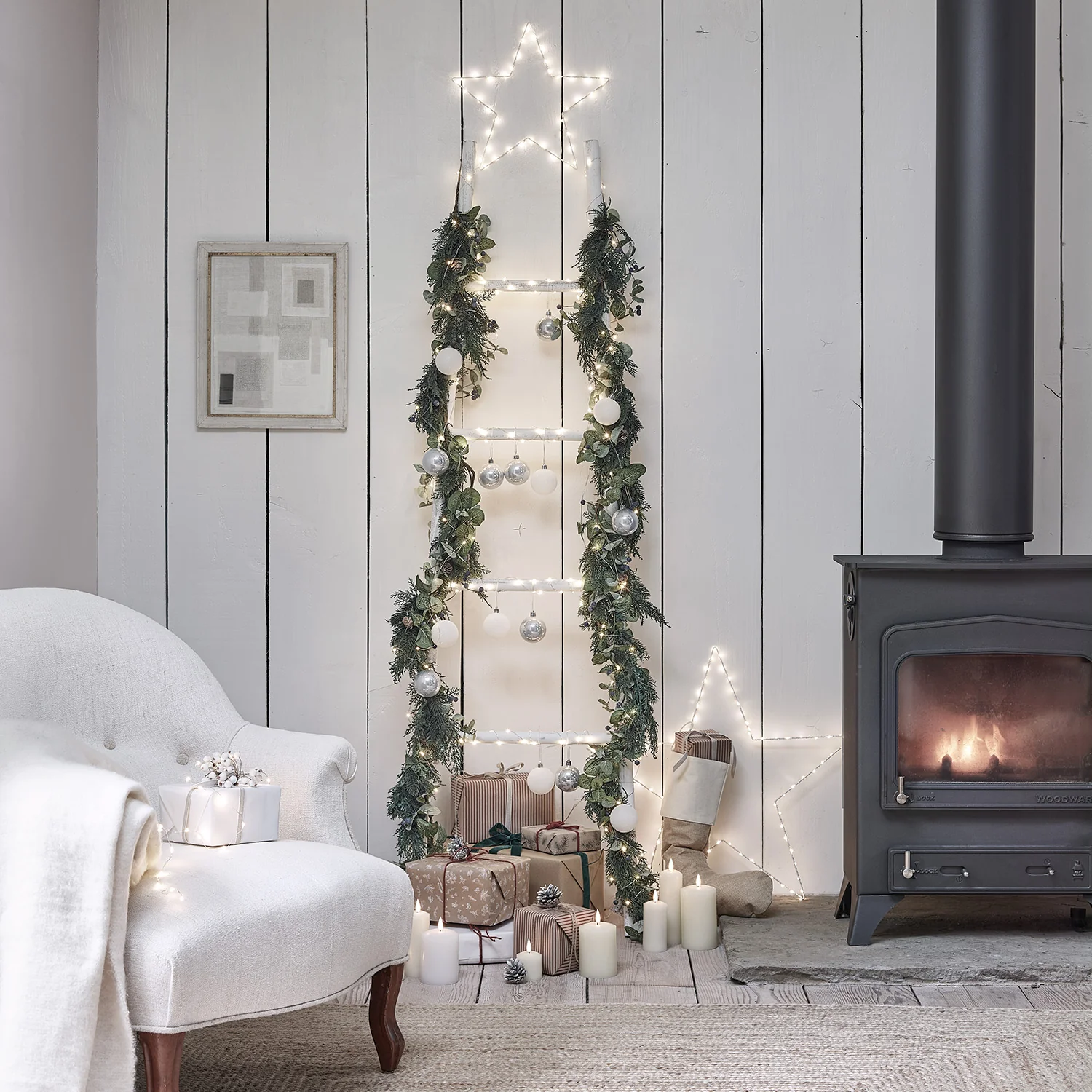 We’ve combined our faux foliage garland with warm white micro lights for the perfect Christmas pair! || The garland comes pre-wrapped in 50 warm white micro lights for some cosy festive sparkle. The garland features pine leave, hints of eucalyptus, acorns and berries. At 2m in length this full garland is made for mantelpieces and staircases for the perfect evergreen throughout the festive season.