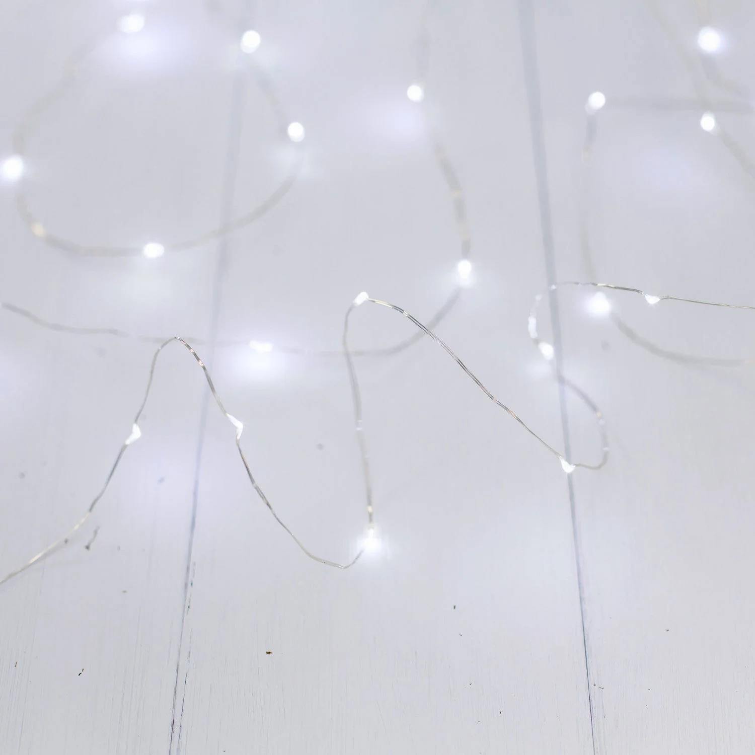 Project a cool white glimmer across your home or garden with our 50 white LED micro battery lights. || These dainty micro bulbs are evenly spread along a malleable silver wire which measures 4.9 metres in length. Our micro lights look gorgeous styled in glass domes or woven into festive wreaths as table decorations.
