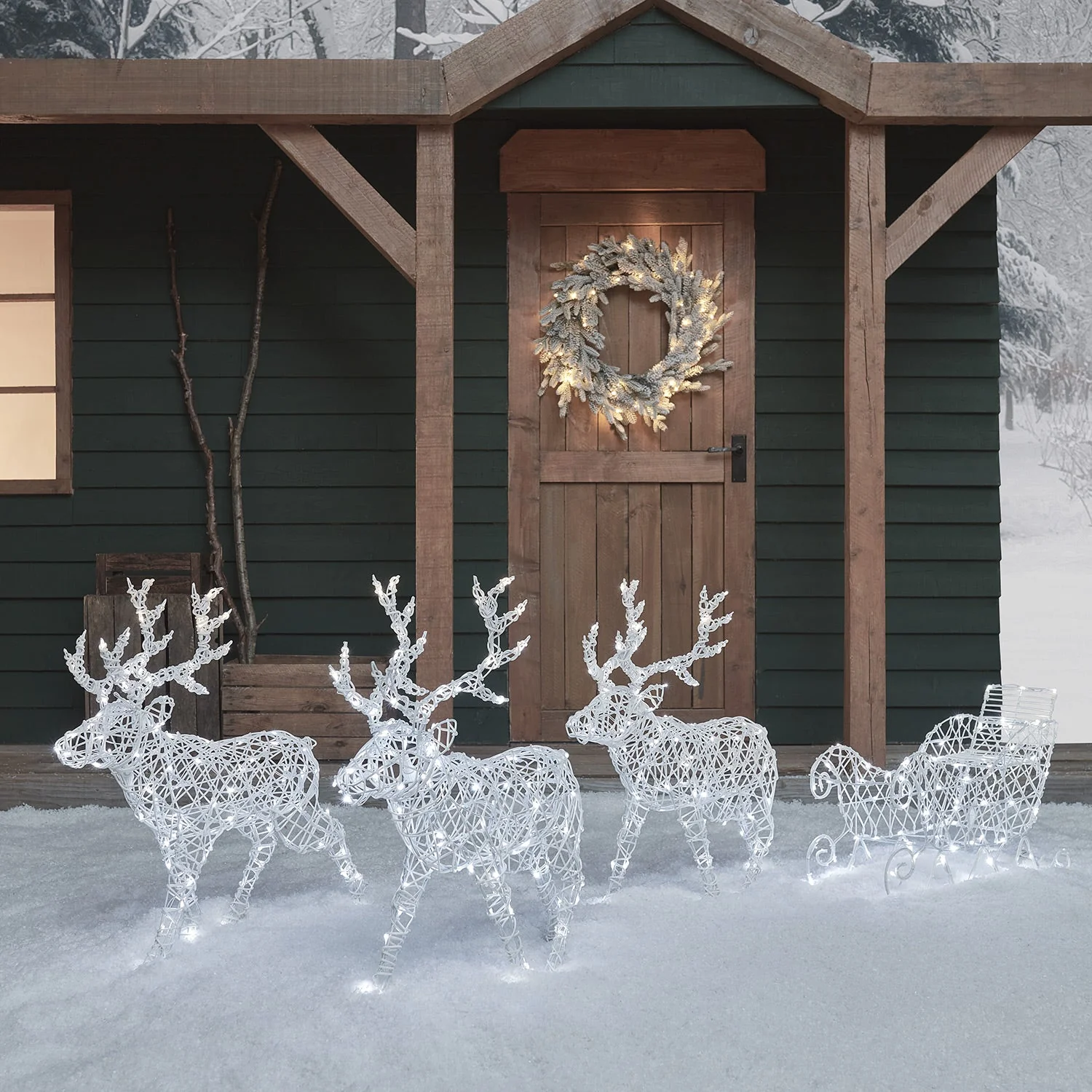 Bring the festivities home this Christmas with our Arkendale dual coloured LED reindeer and sleigh bundle. || At 70m in height and powered completely by battery, this magical Christmas decoration features 3 walking reindeer and a sleigh, each hand wrapped with a white rattan effect to bring the beauty of the North Pole right to your garden. The reindeer were designed in house by studying wild Caribou and are illuminated with 300 dual coloured LEDs so you can choose to light up your space in either white, warm white, or a mixture of the two. With the option to connect up to 6 reindeer in total, you can personalise your decoration for your dream Christmas display. To use, simply pop the 6 x D batteries into the battery box and use the optional 6 hour timer function for an automatic illumination at the same time each night.